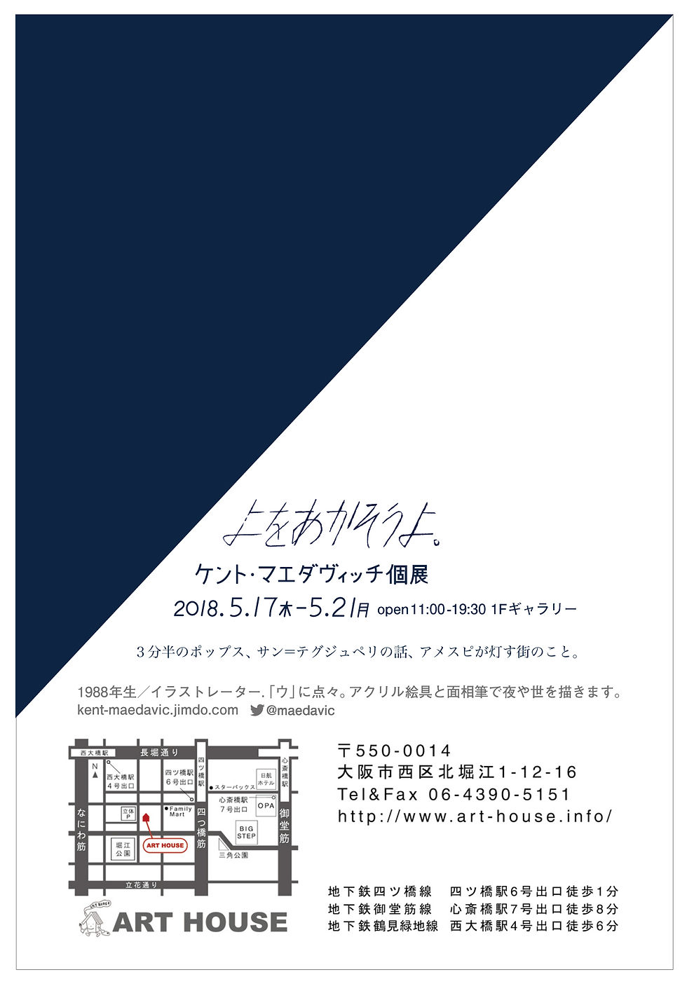 雑誌ケトル「松本清張特集」挿絵や劇作家 前田司郎氏著作の装画等、『個』とコミットするイラストレーター、ケント・マエダヴィッチによる個展『よをあかそうよ。』が大阪北堀江のギャラリーART HOUSEにて開催される。 夜や世を描いたイラストレーションは2018年5月17日(木)〜21(月)までの5日間展示が行われる。