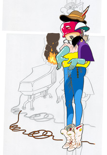 服と身体が一体化した不思議な顔ぶれが淡々と存在する絵。意識ある生き物達の会話中、行動中、変形中の切り取られた瞬間。