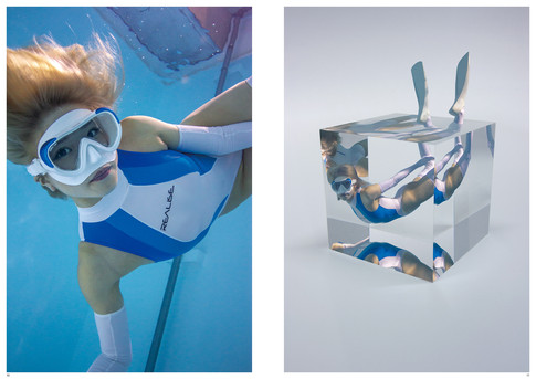 [立方体に切り取られた水の塊] ニーハイソックスの女の子が漂う水の塊を透明なキューブとして切り取る。像は屈折し、反射し、分解された姿が平面作品化される。作品の平面を眺める人が想像を膨らませ、分解された像を「組み立て」ることで立体像がイメージされる。通常の写真以上に水の中の女の子の魅力を克明に表現する。 いろいろな角度から見た(マルチアングルの)被写体をひとつの平面に収めることは、20世紀初頭にピカソやブラックによって創始された「キュビスム」ともつながる。透明なキューブ、そしてタイトルの「cube」の意味するところだ。 もちろんこれは立体作品ではなく、フォトショップを駆使して合成された平面作品だ。写真を撮影することで切り取られる(抽出される)複数の時間、空間、縮尺を再構成していくことで新たな時空が生み出されている。「撮影」よりも撮影前の「設計」と撮影後の「組み立て」に重きをおくことで「ストレート・フォトグラフィ」とは別の道を歩み始めた。撮影という工程を通ってはいるものの、写真集という域には収まらないアートブックとなっている。